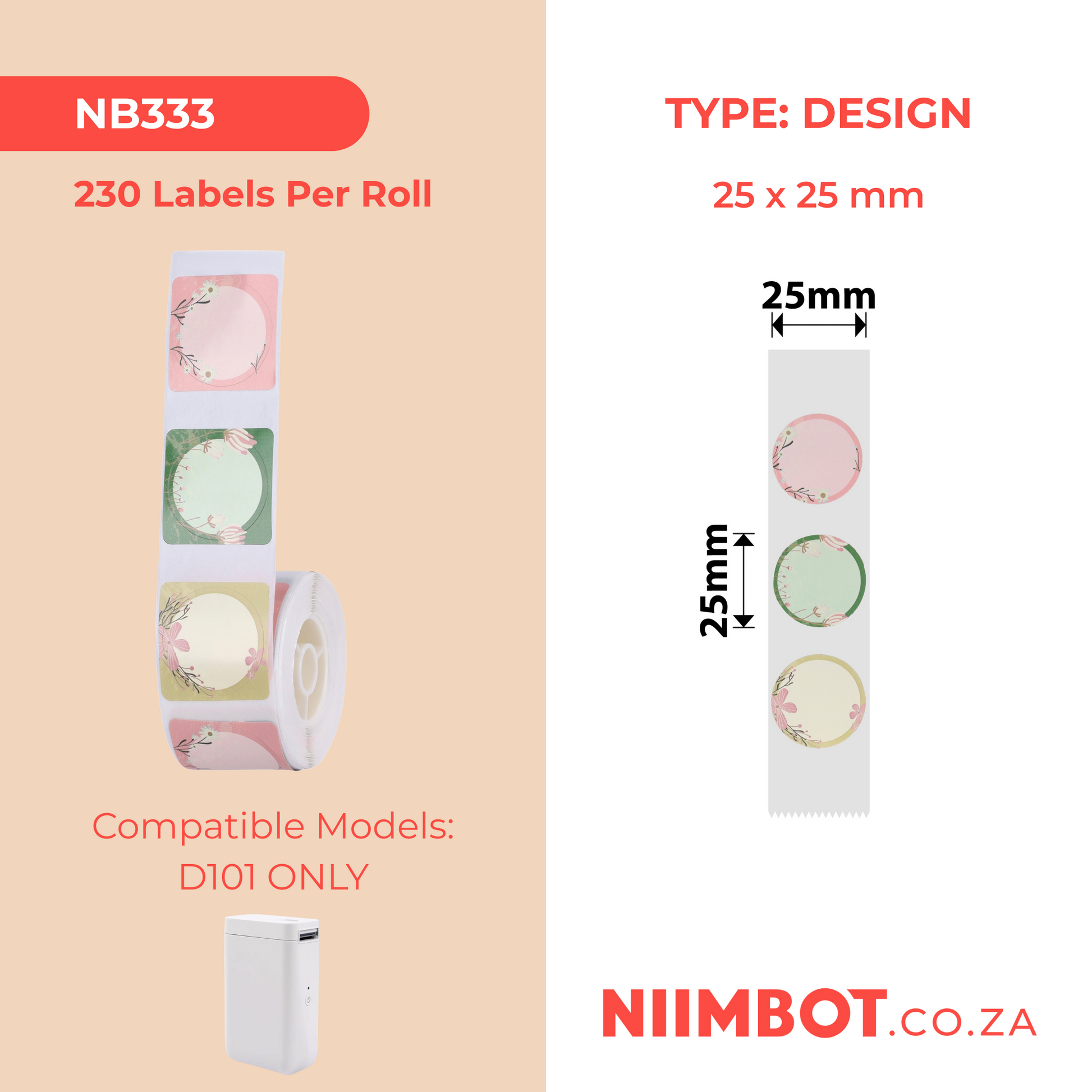 NB333 - NIIMBOT - D101 ONLY - R25X25MM - 230 LABELS PER ROLL - FLOWER DESIGN