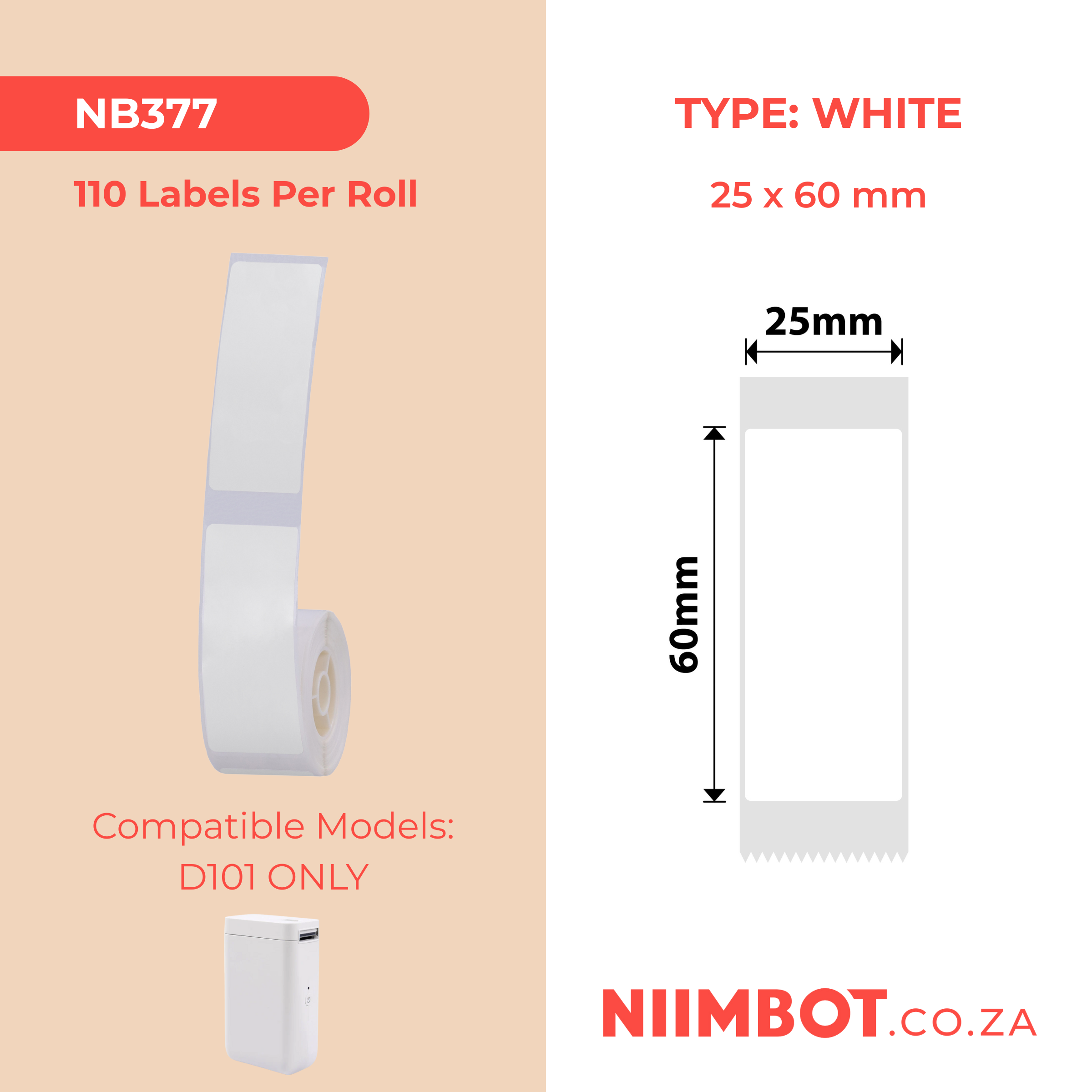 NB377 - NIIMBOT - D101 ONLY - R25X60MM - 110 LABELS PER ROLL - WHITE
