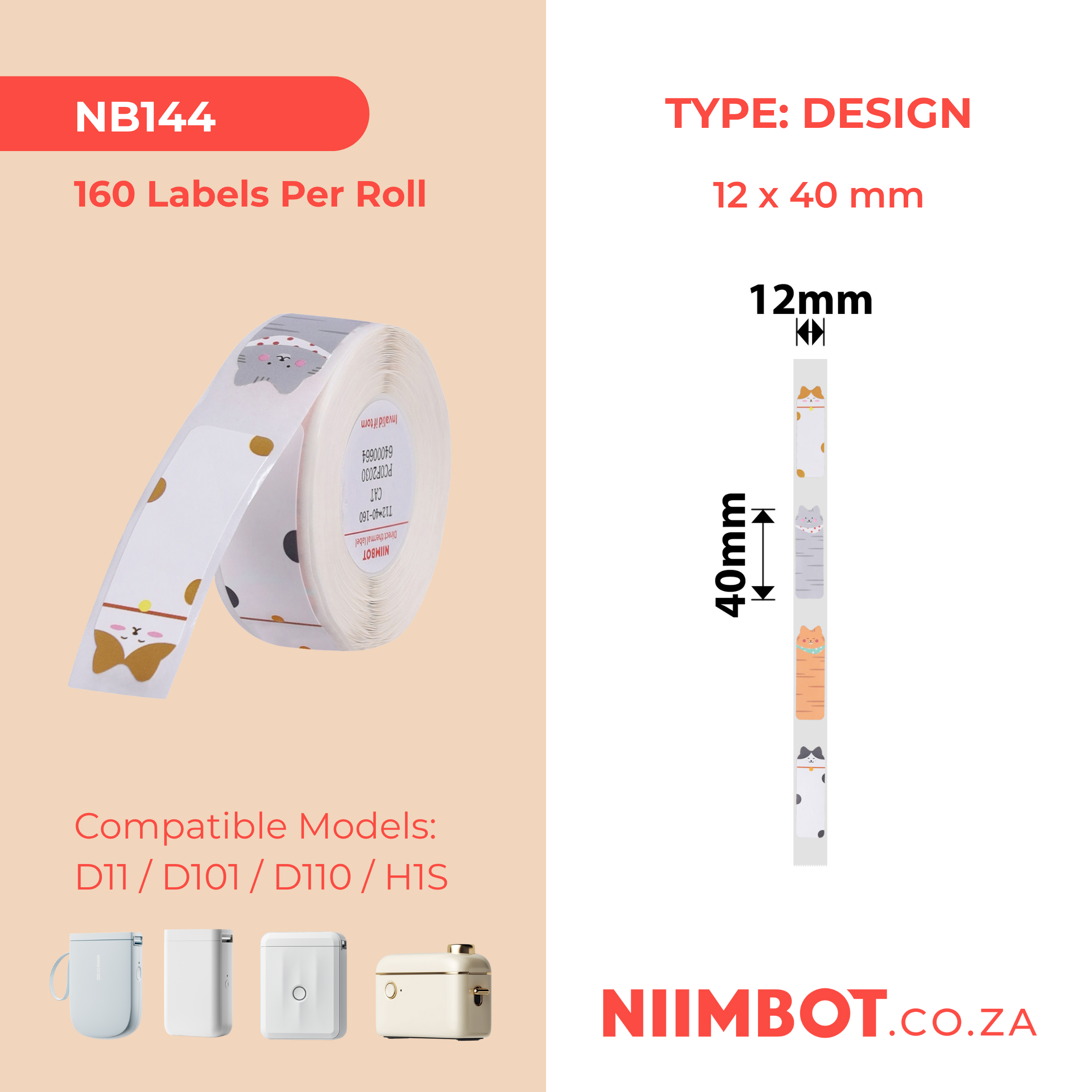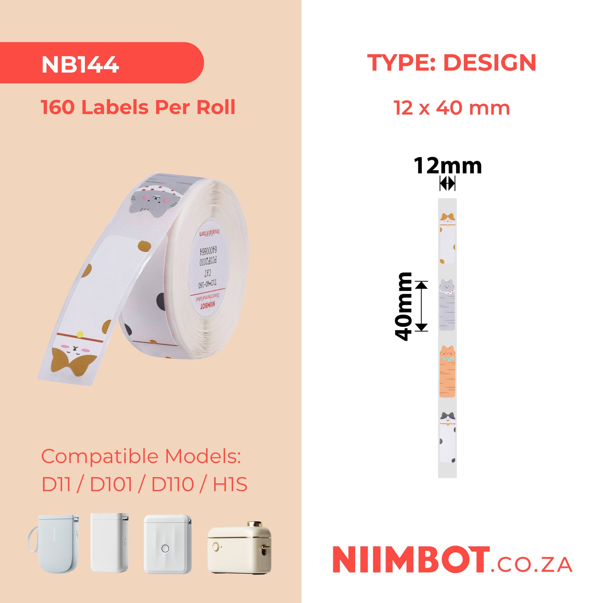 NB144 - NIIMBOT - D11 / D101 / D110 / H1S - RP12X40MM - 160 LABELS PER ROLL - CAT DESIGN